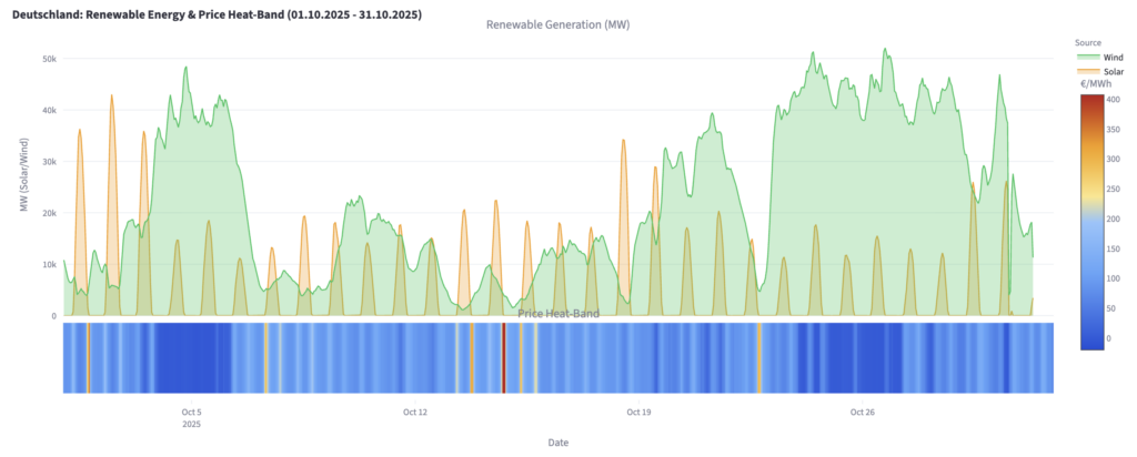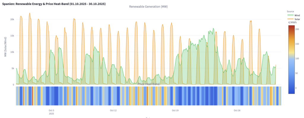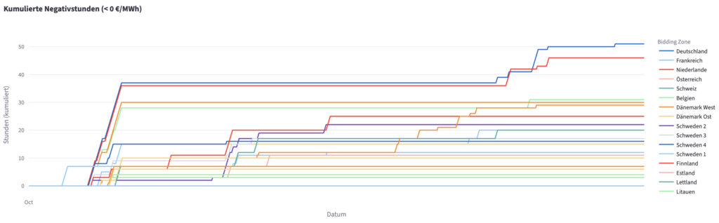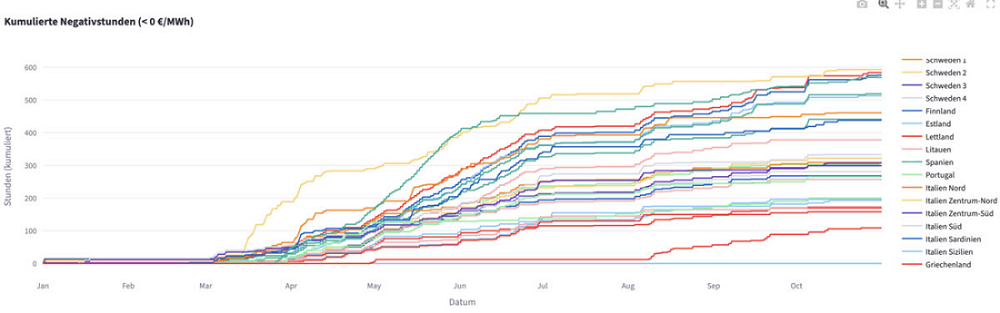 D'après l'analyse de l'outil Strommarkt-App, la durée des périodes de prix négatifs a fortement augmenté sur le continent, la forte croissance de la production d'énergie renouvelable et les fluctuations météorologiques mettant à rude épreuve les réseaux électriques européens. Fin octobre, la deuxième zone tarifaire de Suède enregistrait le plus grand nombre d'heures de prix négatifs (593), suivie des Pays-Bas (584), de l'Allemagne (576), de l'Espagne (569), de la Belgique (519) et de la France (513).